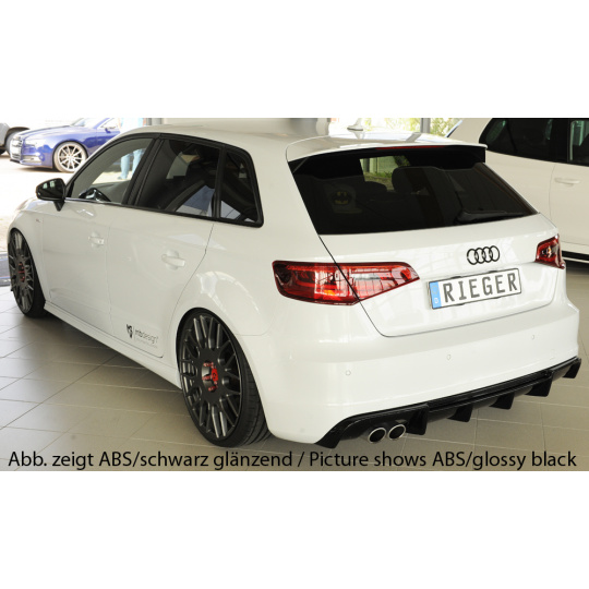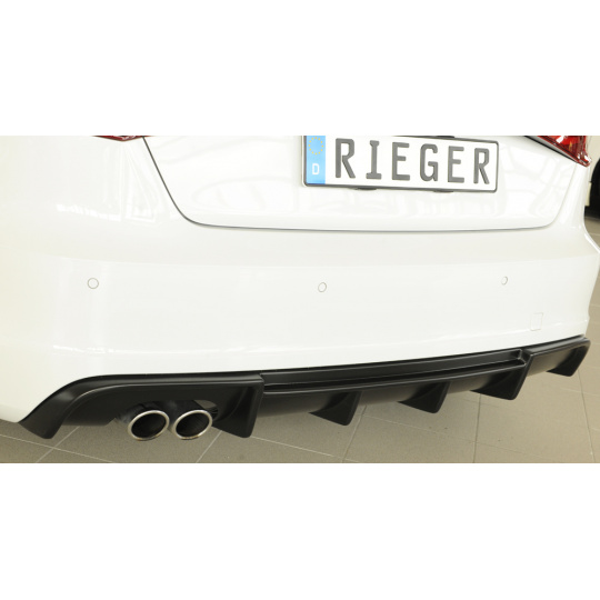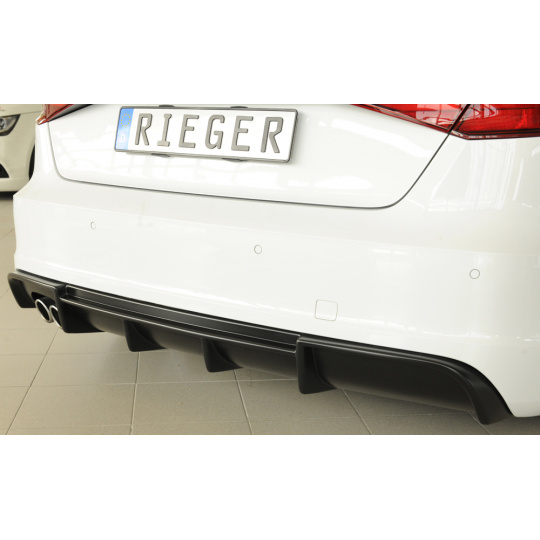 Vložka zadního nárazníku Rieger Tuning určená pro Audi A3 Typ 8V před faceliftem, karoserie 3-dv. hatchback (8V1) a 5-dv. Sportback (8VA), roky 07/12–08/16. Vyrobena z ABS plastu bez povrchové úpravy. Balení obsahuje montážní materiál.