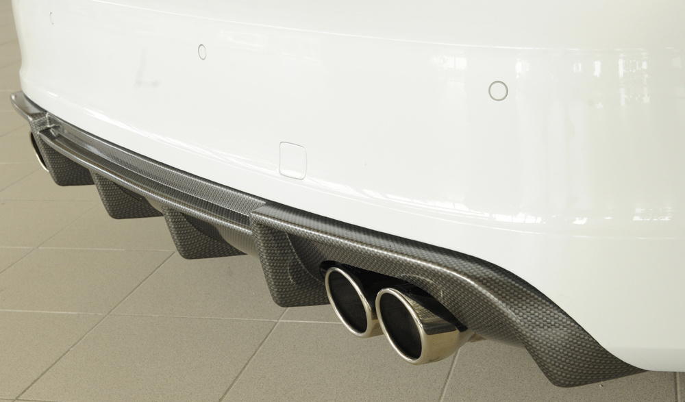 Rieger vložka zadního nárazníku pro Audi A3 8V 3-dvéř. (hatchback 8V1), 5-dvéř. (sportback 8VA) před faceliftem, plast ABS s povrchovou úpravou Carbon-Look, pro dvojité koncovky na obou stranách 4x90 mm