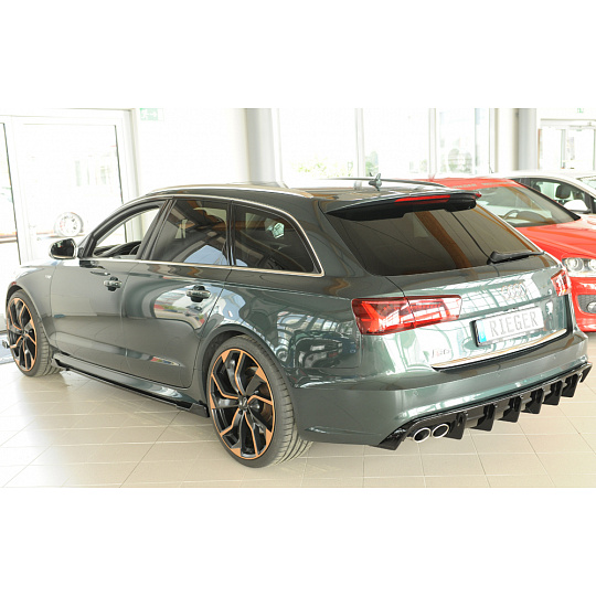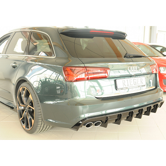 Vložka zadního nárazníku Rieger Tuning určená pro Audi A6 Typ 4G / C7, karoserie Sedan, od 09/14. Vyrobena z ABS plastu lakovaného do černé lesklé barvy (PMMA). Balení obsahuje montážní materiál.
