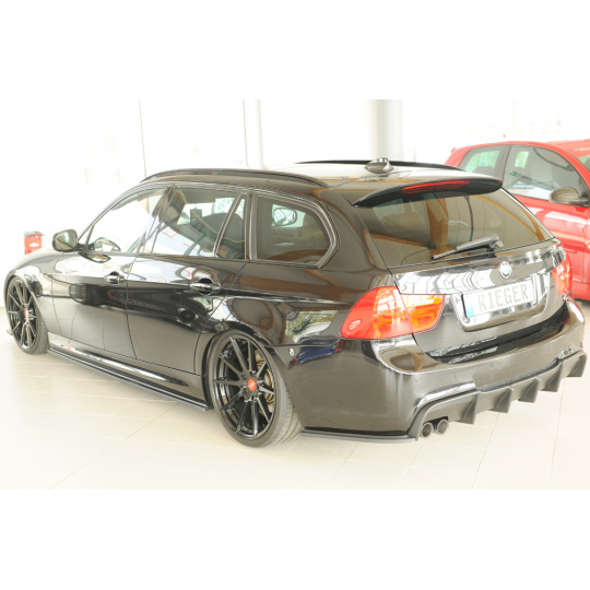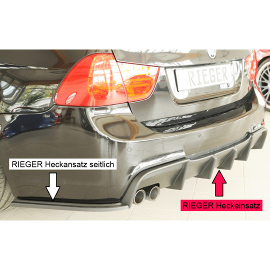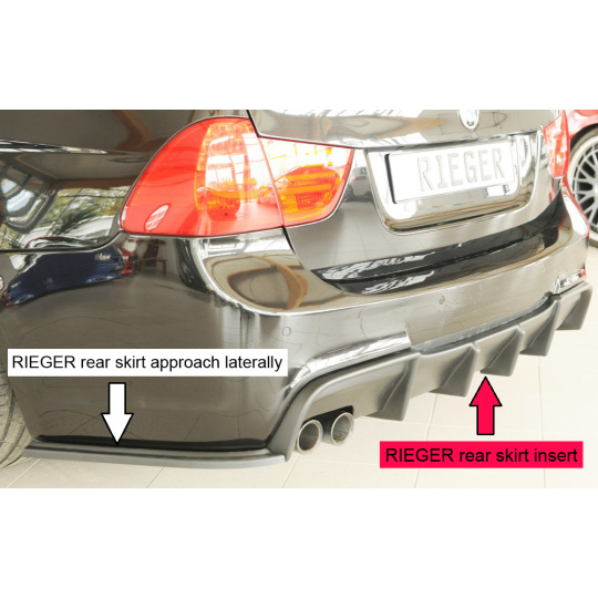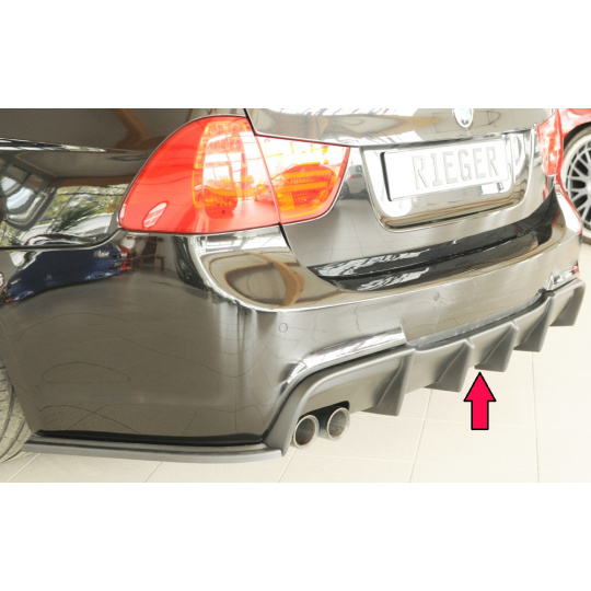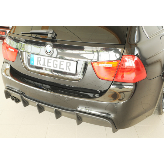 Vložka zadního nárazníku Rieger Tuning určená pro BMW řada 3 Typ E90/E91, karoserie sedan, touring, od 09/2008. Vyrobena z ABS plastu bez povrchové úpravy (určeno k lakování). Součástí balení je montážní materiál.