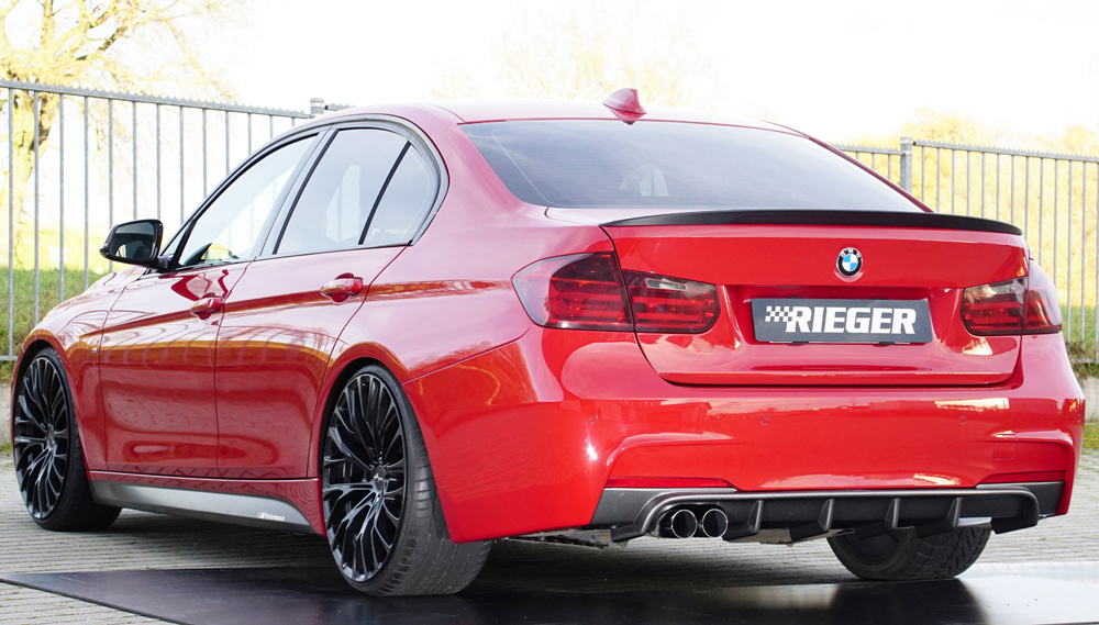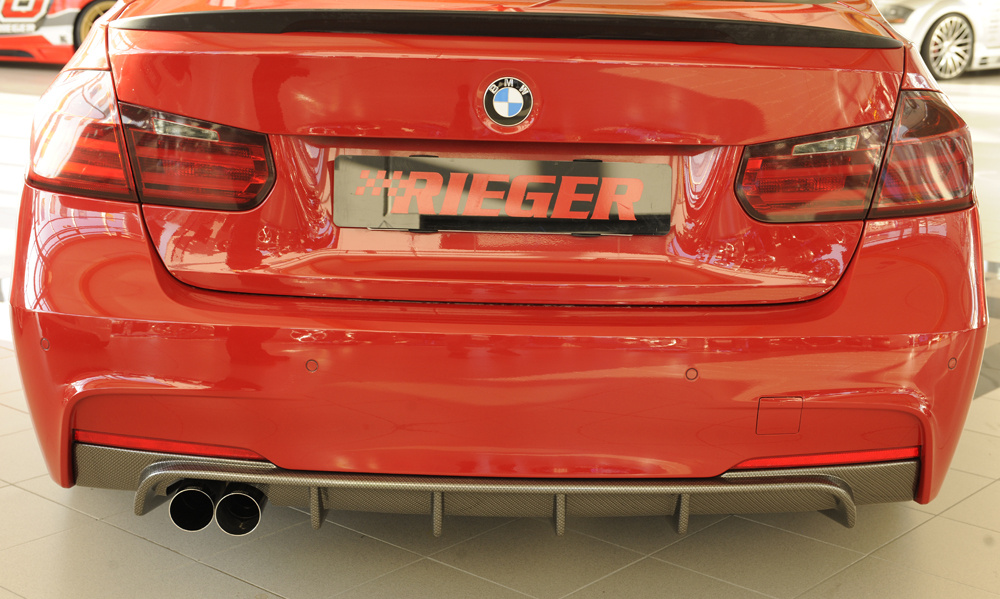 Vložka zadního nárazníku Rieger Tuning určená pro BMW řada 3 Typ F30/F31, karoserie sedan, touring včetně faceliftu. Platí pro vozy 02/12–06/15, 10/12–06/15 a od 07/15. Vyrobena z ABS plastu s povrchovou úpravou Carbon-Look. Součástí balení je montážní materiál.