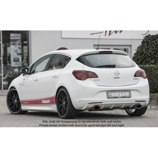 Vložka zadního nárazníku Rieger Tuning určená pro Opel Astra J, karoserie 5-dvéř. hatchback po faceliftu, od 10/2012–. Vyrobena z ABS plastu bez povrchové úpravy. Součástí balení je montážní materiál.