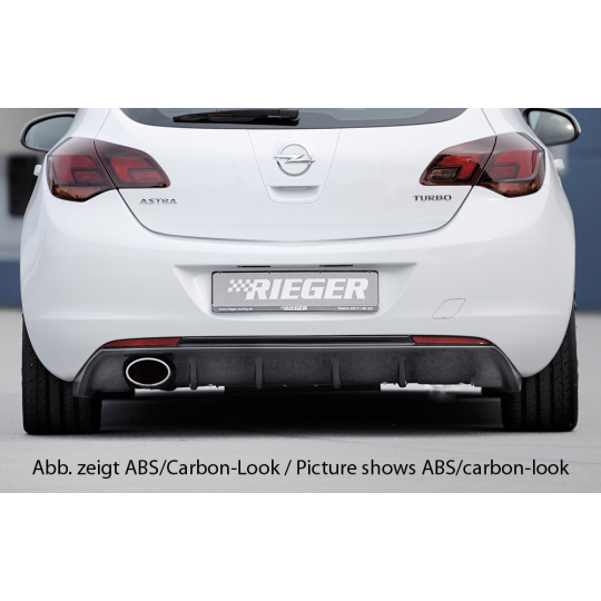 Vložka zadního nárazníku Rieger Tuning určená pro Opel Astra J, karoserie 5-dvéř. hatchback před faceliftem, pro roky výroby 11/2008–09/2012. Vyrobena z ABS plastu bez povrchové úpravy. Součástí balení je montážní materiál.
