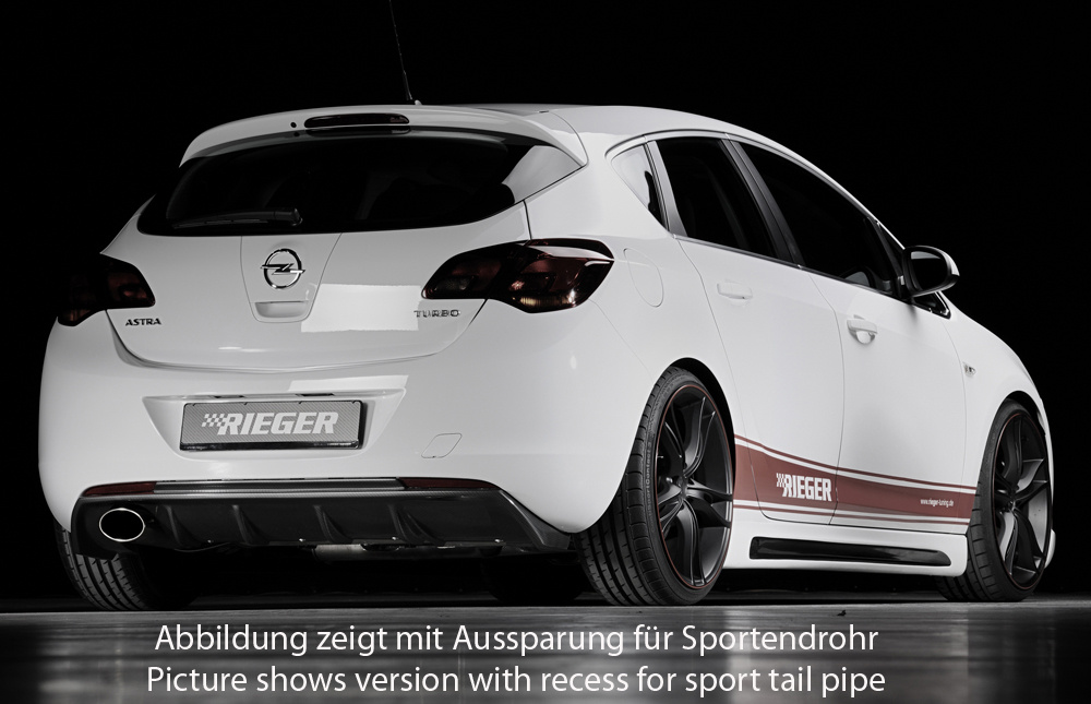 Vložka zadního nárazníku Rieger Tuning určená pro Opel Astra J, karoserie 5-dvéř. hatchback před faceliftem, pro roky výroby 11/2008–09/2012. Vyrobena z ABS plastu s povrchovou úpravou Carbon-Look. Součástí balení je montážní materiál.