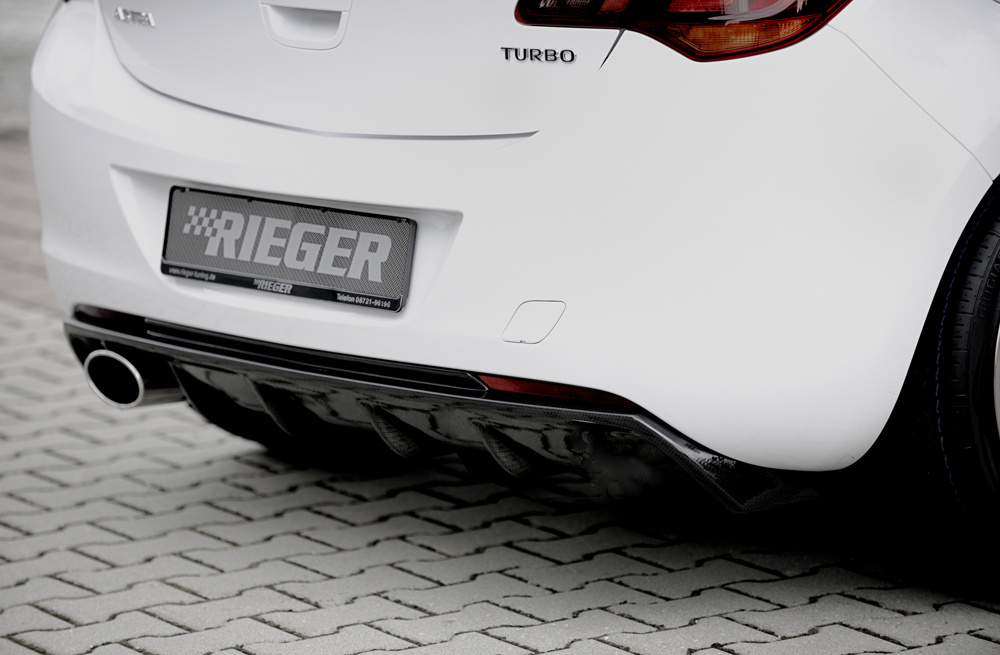 Vložka zadního nárazníku Rieger Tuning určená pro Opel Astra J, karoserie 5-dvéř. hatchback před faceliftem, pro roky výroby 11/2008–09/2012. Vyrobena z ABS plastu s povrchovou úpravou Carbon-Look. Součástí balení je montážní materiál.