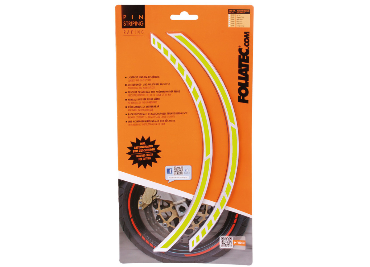 Samolepící proužky FOLIATEC RACING pro 17" kola představují jednoduchý a efektivní způsob, jak dodat sportovní vzhled vašemu motocyklu nebo vozu.