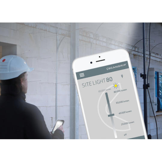 Pracovní světlo SITE LIGHT 80 je vybaveno "stmívačem" pro regulaci intenzity světla a ovládáním pomocí mobilního zařízení přes bluetooth. Zabudovaná rukojeť a nízká váha zajistí snadnou manipulaci. Reflektor je zcela odolný vůči prachu a vodě (IP65) a je určen pro použití v rozmězí mezi -25°C - 40°C. Díky vysoce kvalitním součástkám a aktivnímu chlazení má reflektor dlouhou životnost a udržuje vysoký výkon po celý pracovní den.