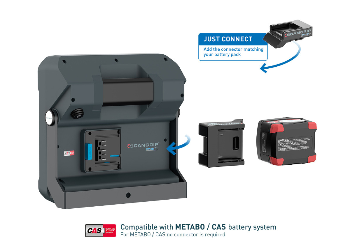 Kompatibilní s METABO / CAS bateriovým systémem a všemi ostatními 18 V/20 V bateriovými sadami pomocí SCANGRIP CONNECTOR