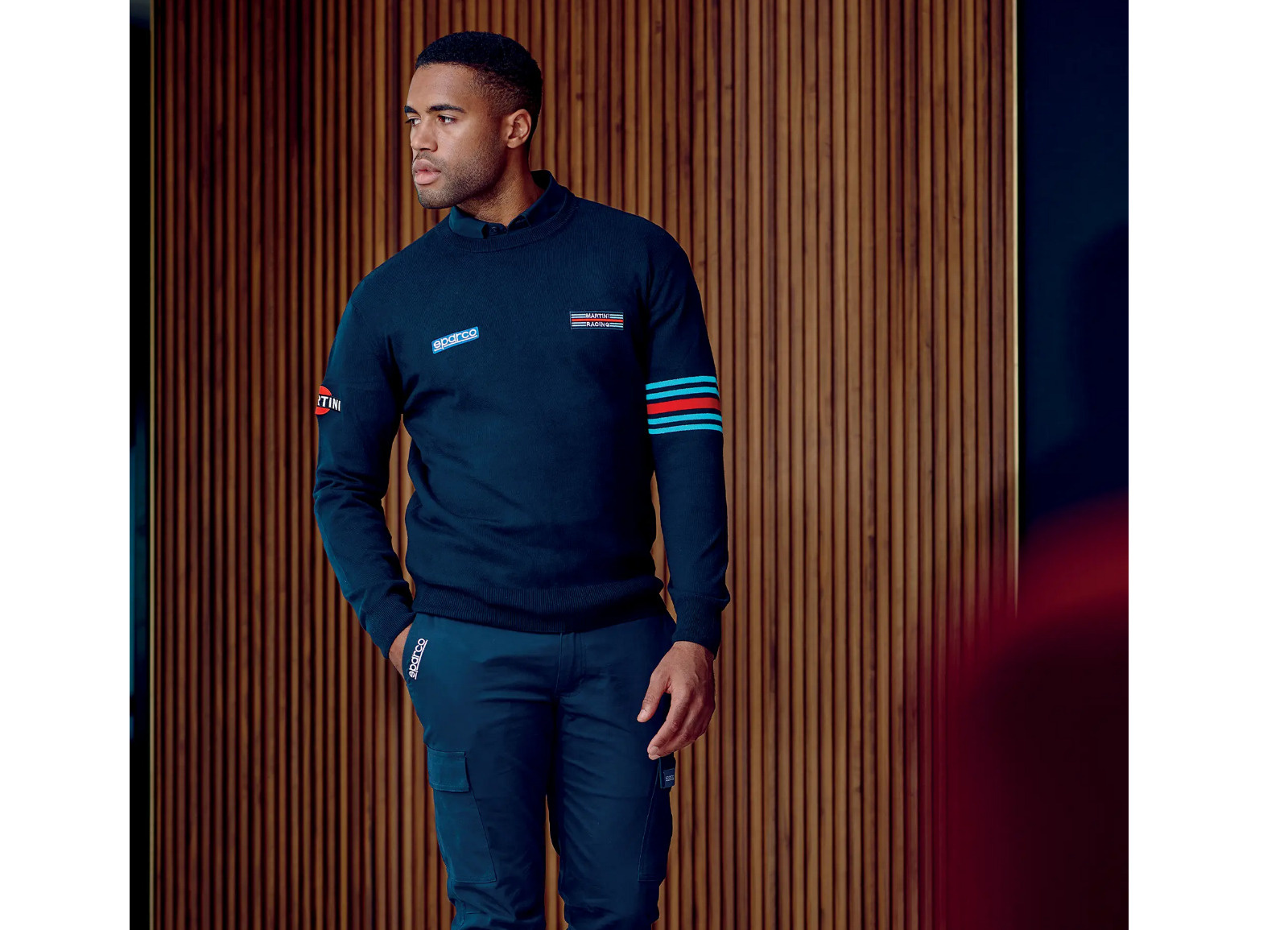 Měkký bavlněný svetr s výstřihem, navržený pro pohodlí a styl s ikonickým designem Martini Racing.