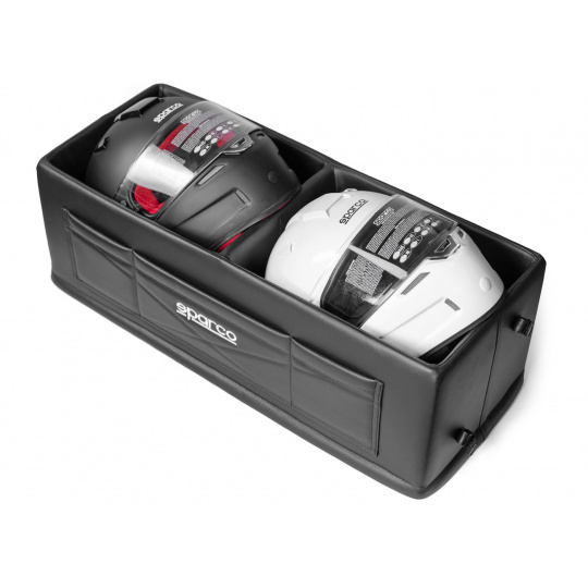 Sparco box na helmy je praktický úložný prostor pro bezpečné uskladnění závodní helmy. Disponuje integrovanými kapsami a poutky, které umožňují snadné upevnění a přenášení.