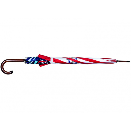 Deštník Replica 80s s automatickým otevíráním a dřevěnou rukojetí kombinuje ikonický styl pruhů Martini Racing vytištěných ve vysokém rozlišení s ultralehkou technologií laminátových lamel.