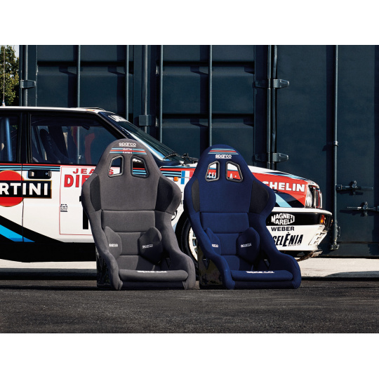 Závodní sedadlo Sparco Pro 2000 QRT v legendární edici Martini Racing. Dostupné ve dvou atraktivních barevných kombinacích. Sedák je protiskluzový, zobrazené polštáře jsou součástí.