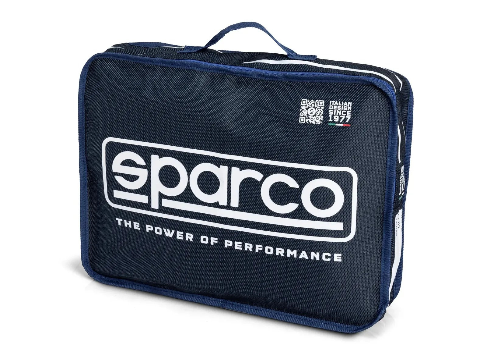 - Potisk Sparco: Velké a přehledné logo na vnější straně zajišťuje rychlou identifikaci vaku při organizaci výbavy během rušných závodních dní.
