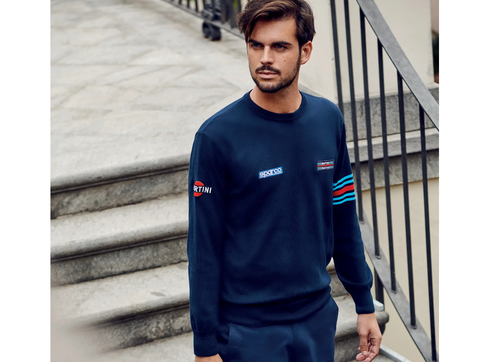 Stylový svetr s ikonickými pruhy Martini Racing a výšivkou na hrudi. Kombinace merino vlny a akrylu zajišťuje měkkost a tepelný komfort.