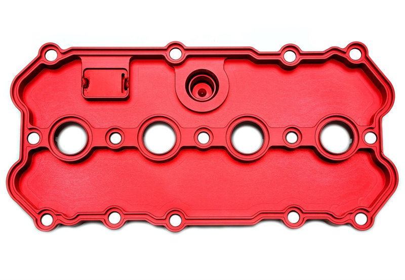 Víko ventilů v červeném provedení, frézované na CNC z jednoho kusu z vysoce pevné hliníkové slitiny 6061.