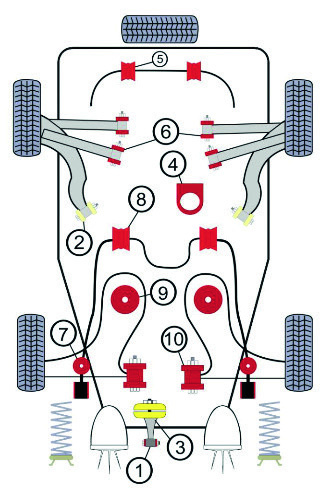 Pozice silentbloků na podvozku je zobrazena na přiloženém schématu - pozice č. 5.