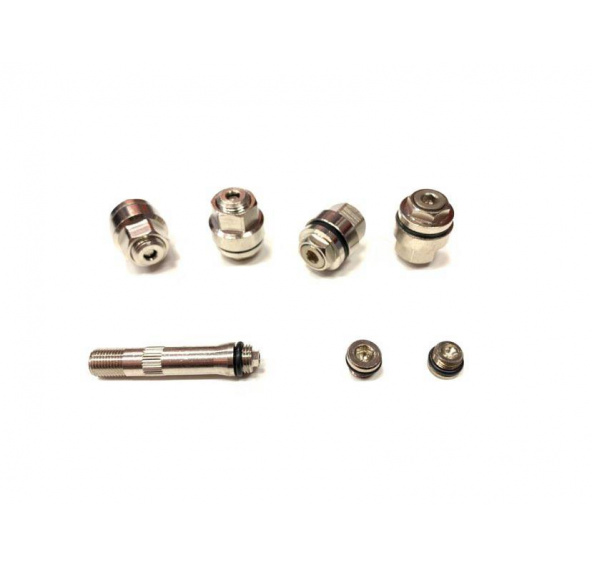 Sada obsahuje 4 skryté ventilky, 2 náhradní čepičky a 1 šroubovací adaptér pro huštění