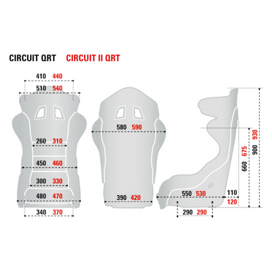 Sedadlo je dostupné ve dvou velikostech (Circuit QRT a Circuit II QRT). Porovnání rozměrů jednotlivých verzí naleznete mezi obrázky.