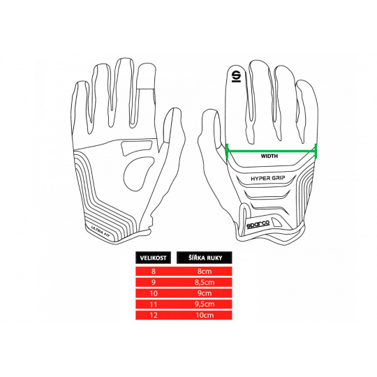 - Velikosti se liší od motorsportových rukavic: Pro správné určení velikosti změřte šířku dlaně dominantní ruky (pravé pro praváky, levé pro leváky) bez palce.