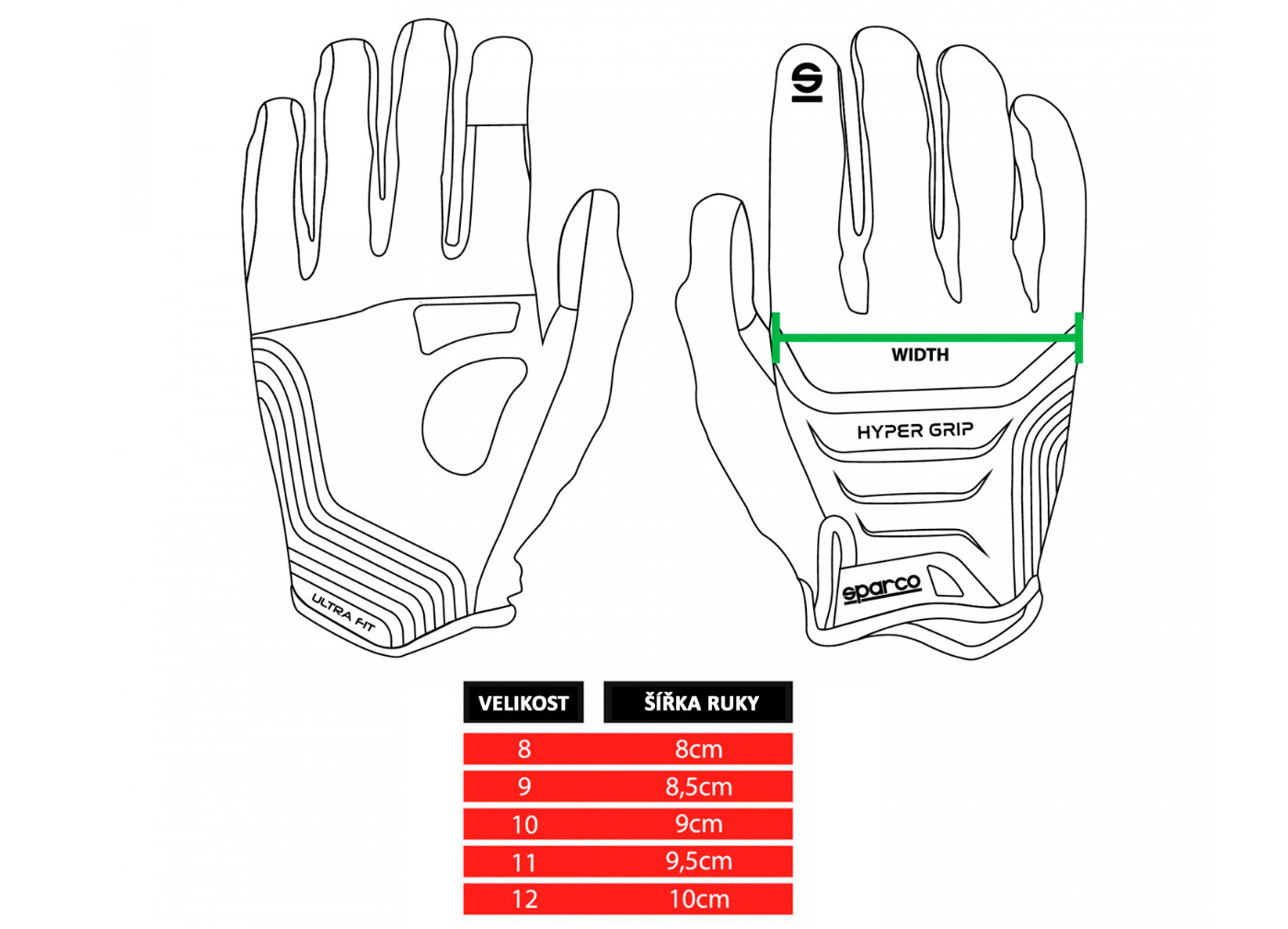 - Velikosti se liší od motorsportových rukavic: Pro správné určení velikosti změřte šířku dlaně dominantní ruky (pravé pro praváky, levé pro leváky) bez palce.