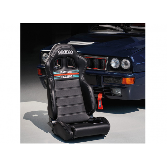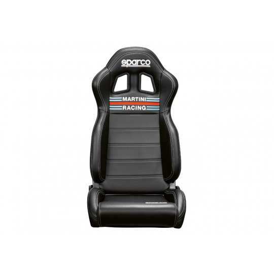 Sklopné sportovní sedadlo Sparco R100 Martini Racing má na opěradle klasické logo Martini Racing a je čalouněno do černé koženky, která zaručuje dlouhou životnost a snadnou péči o povrch sedadla.