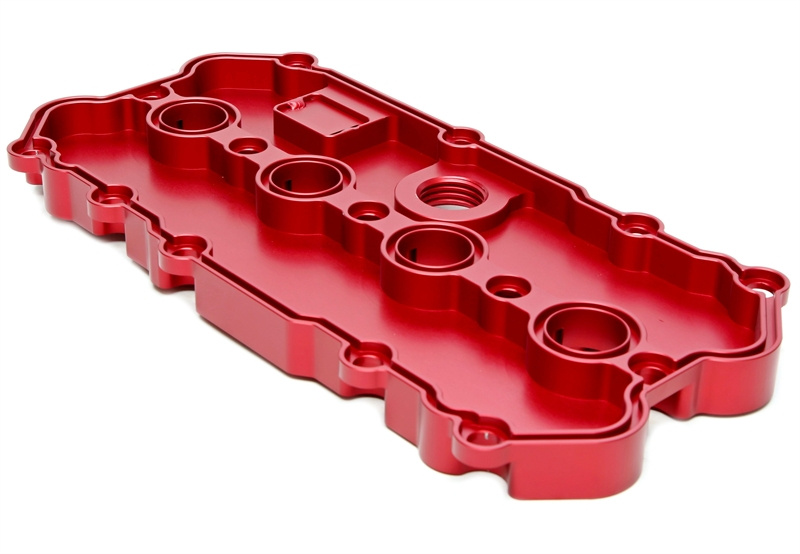 Víko ventilů v červeném provedení, frézované na CNC z jednoho kusu z vysoce pevné hliníkové slitiny 6061.