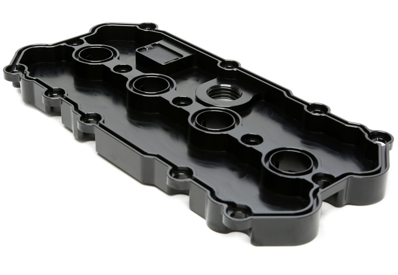 Víko ventilů v černém provedení, frézované na CNC z jednoho kusu z vysoce pevné hliníkové slitiny 6061.