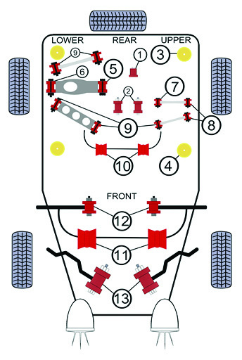Pozice silentbloků na podvozku je zobrazena na přiloženém schématu - pozice č. 10.
