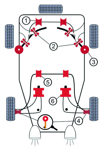 Pozice silentbloků na podvozku je zobrazena na přiloženém schématu - pozice č. 2.