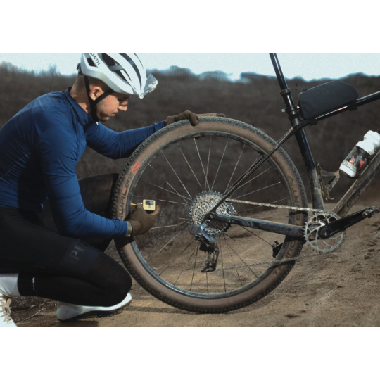 Tělo kompresoru má kompaktní rozměry 73,1 mm x 46,6 mm x 33,8 mm a má povrch z neklouzavého TPU, který zajišťuje snadnou a jistou manipulaci a odolnost proti otřesům a nárazům. Presta adaptér pro dofukování vás dostane bleskově zpět do sedla (součástí balení také Schrader hadice pro běžná kola).