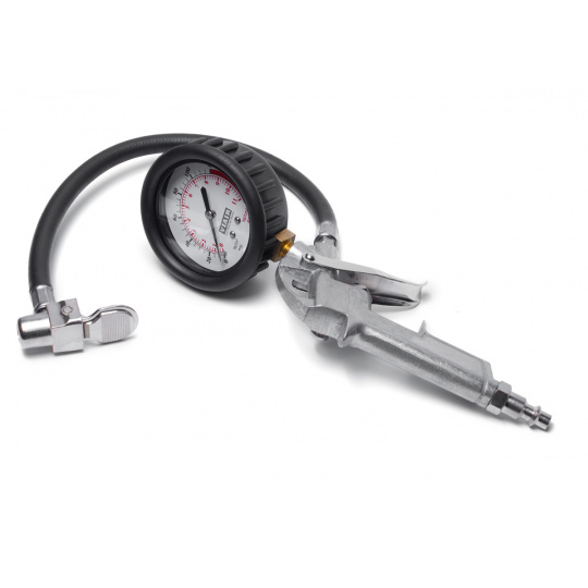 - pistole osazená 3" analogovým manometrem se stupnicí v BAR (max. 14 bar) a PSI (max. 150 PSI) a upouštěcím ventilem pro přesné doladění tlaku