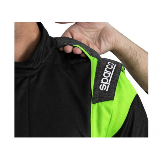 Řada Sparco Full Efficiency. 3 vrstvá konstrukce, plně regenerovaná podšívka a tkanina. Více než 70% recyklovaných materiálů. Výztužné vložky z recyklovaného materiálu. Strečový vnitřní stehenní panel. Homologace FIA 8856-2018; SFI 3,2A/5